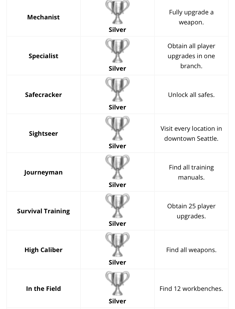 - 한 지점의 모든 플레이어 업그레이드 항목을 획득하십시오. (기술 항목 트리 중 하나의 라인에 있는 모든 기술 배우기)